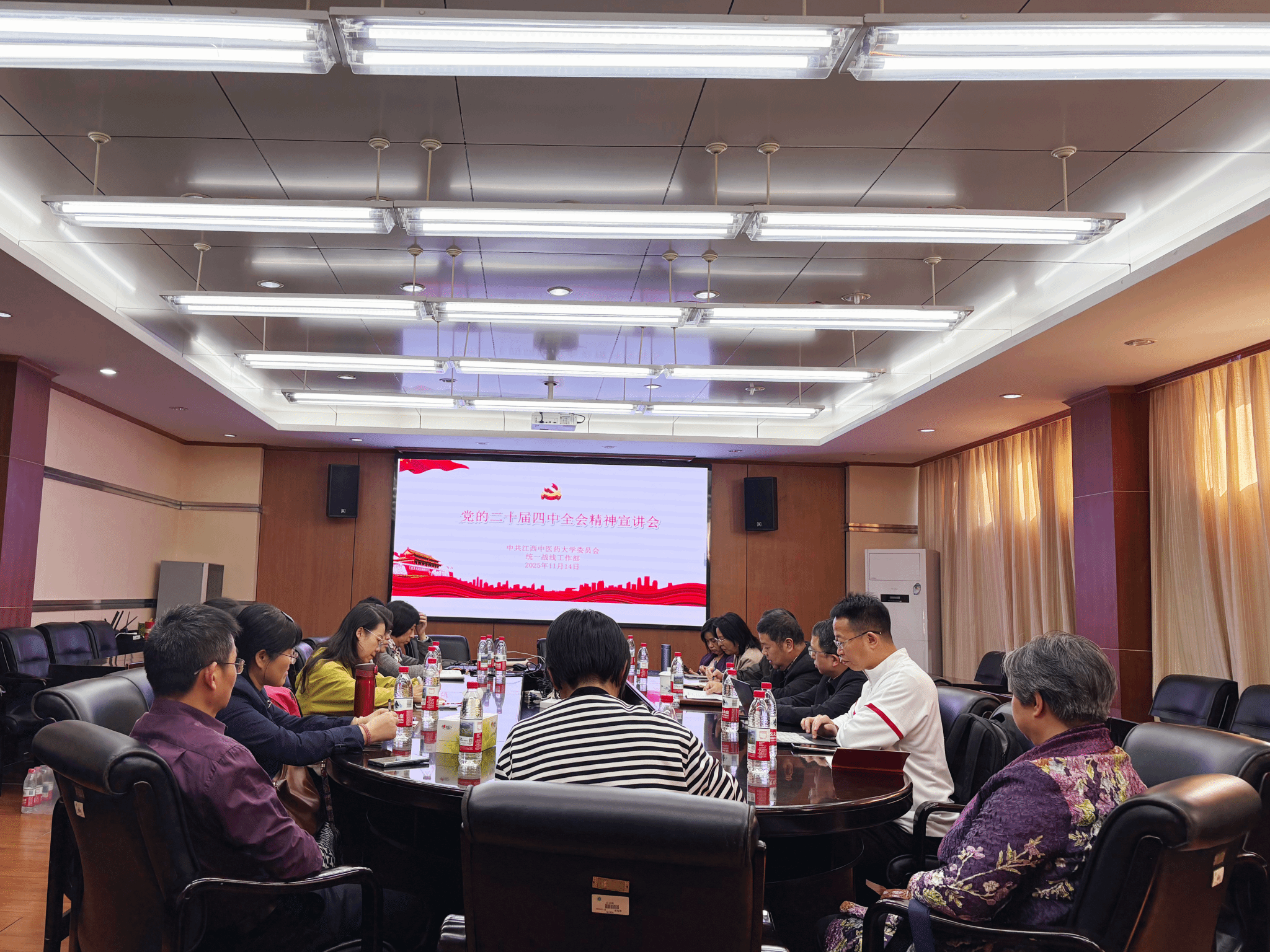 为深入学习宣传贯彻党的二十届四中全会精神,11月14日下午,学校党委统战部在行政楼一楼会议室组织召开全校民主党派及无党派人士学习党的二十届四中全会精神宣讲会。学校党委委员、统战部部长薛铁瑛担任主讲人,学校各民主党派主委、副主委、委员、无党派代表人士等参加了宣讲会。