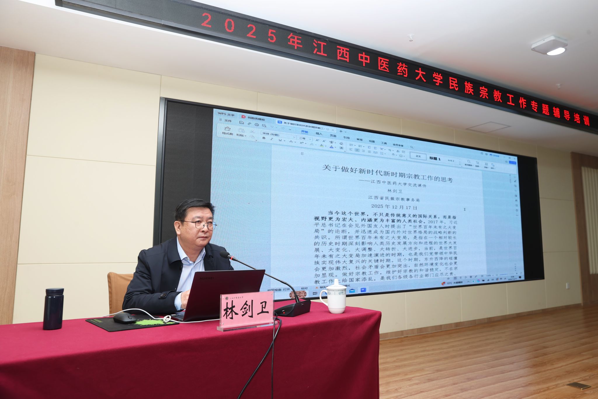 林剑卫作了题为“关于做好新时代新时期宗教工作的思考”专题辅导报告,他立足国际国内大背景,结合高校宗教工作实际情况,从“为什么、是什么、怎么办”的逻辑思路出发,客观分析了我国宗教领域面临的形势和任务,深入学习了习近平总书记关于宗教工作的重要论述,重点领学了思想体系中的“九个必须”、“三大规律”,以及宗教工作方略中关于“引导宗教适应论”“坚持我国宗教中国化”“提高宗教工作法治化水平”的精髓内涵,对于学校着力提升新时代宗教工作的能力和水平,具有很强的现实指导意义。